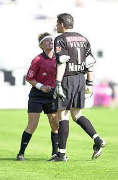 PETIGNAT Nicole stoppt MANDL Thomas bei seinem Lauf zum Linienrichter